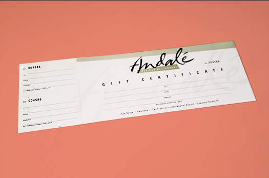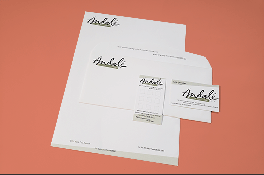 Russell Leong, of Russell Leong Design, designed an amazing logo for Andale. While I worked there, he entrusted me to design their business system (business card, envelope, letterhead and reward card) and gift certificate. I used the logo’s existing look and feel and developed the business system to match.